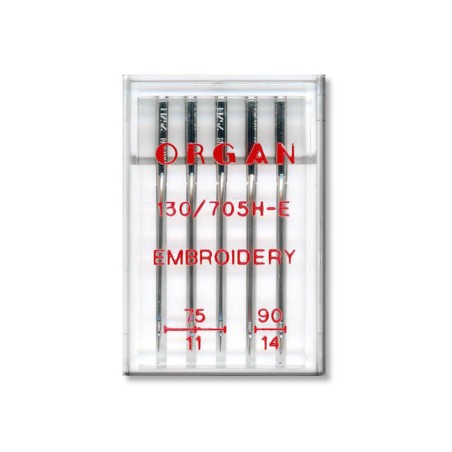 Jehly ORGAN 130/705H Embroidery – 5 ks. Větší očko a drážka pro plynulý chod vyšívacích nití.