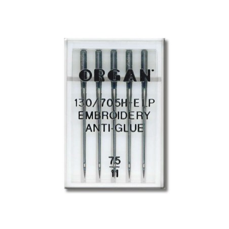 Jehly ORGAN 130/705H Embroidery AntiGlue – 5 ks. Nelepivý povrch pro šití s lepicími stabilizátory, větší očko pro vyšívací nitě.