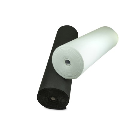 Podkladový materiál Madeira E-ZEE PES Soft 80 g/m² v roli 90 cm × 100 m, bílý nebo černý. Stříhací stabilizátor pro náročné výšivky na různé textilie včetně triček.
