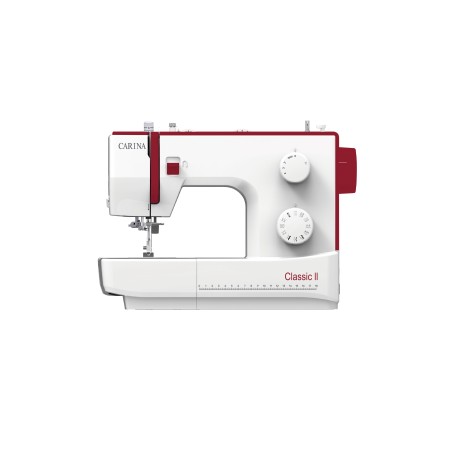 Carina Classic II je mechanický domácí šicí stroj s 32 programy stehů, automatickou jednokrokovou knoflíkovou dírkou a možností šití dvojjehlou. Disponuje jasným LED světlem, automatickým navlékačem jehly, automatickým přítlakem nitě, integrovanou mechanickou zásuvkou na příslušenství a otočnými kolečky pro délku (do 4 mm) a šířku stehu (do 4,6 mm). Robustní 70 W motor a kovový CB chapač zajišťují spolehlivý výkon. Váží cca 6 kg.